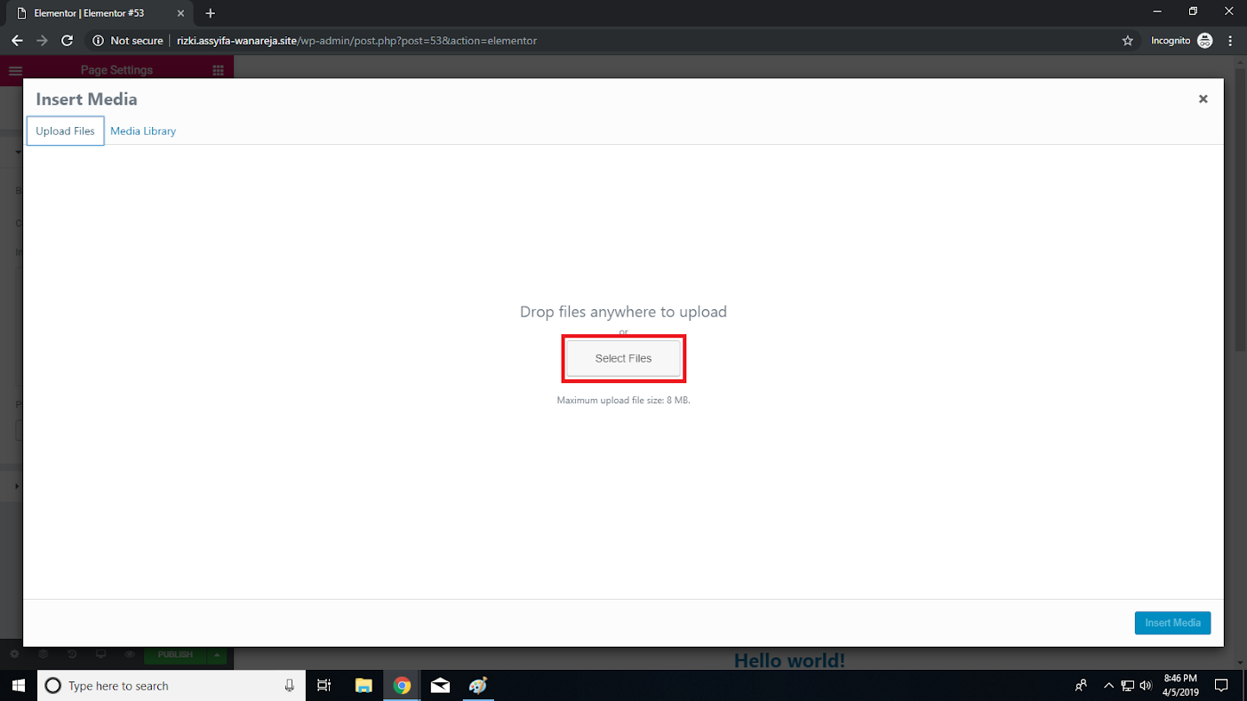 - Lalu pilih gambar yang sudah diupload sebelumnya pada tab Media Library, jika gambar belum diupload sebelumnya klik tab Upload Files, lalu klik tombol Select Files